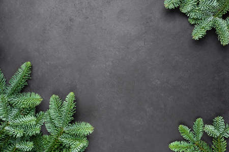 Christmas dark grunge background, fir twigs, top view. Winter holidays, New Year decoration, pine tree branches frame on black concrete, rough cement texture, flat lay, copy space.