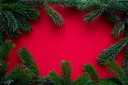 Red bright Christmas background. Winter frame of green branch and needle on the textured fabric background. Copy space. Top view.