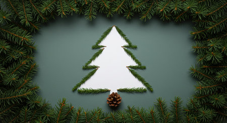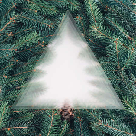 Christmas tree shaped negative space with frame made of fir branches. Winter holidays concept. Pastel white background. Flat lay. New Year greeting card. Glassmorphism style.