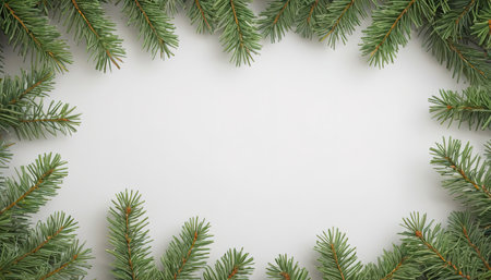 Christmas tree branches, evergreen foliage framing a blank white background, perfect for holiday themed designs or greetings, conveying a festive and cheerful atmosphere