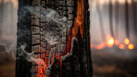 Close-up of charred trees and smoldering debris in the aftermath of a forest fire, depicting the devastation