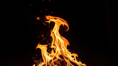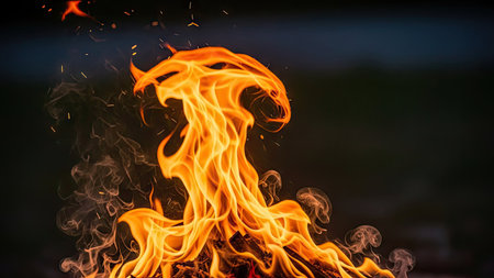 An image captures dynamic flames with orange and yellow hues, swirling smoke, and a dark backdrop. The composition features abstract patterns and textures suggestive of energy and movement. The scene, possibly outdoors at night, could be utilized for various commercial and illustrative purposes.