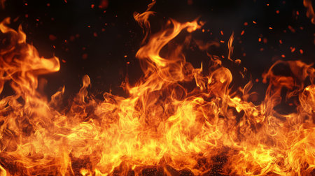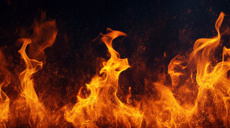 Witness the captivating power of fire with this intense image. A close-up view of fire flames takes center stage against a dark black background, creating a mesmerizing and dynamic composition. The vibrant and flickering flames create a sense of energy and intensity, while the black backdrop adds depth and drama to the scene. Perfect for projects related to heat, energy, passion, danger, and the elemental force of fire