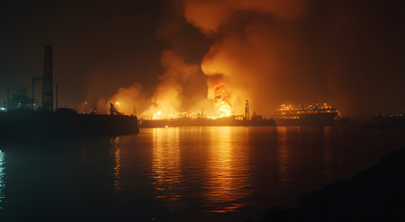 A burning ship creates a dramatic scene on the ocean as flames engulf the vessel under thick black smoke during the night