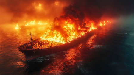 AI Generated. Ships engulfed in flames on a fiery horizon at twilight