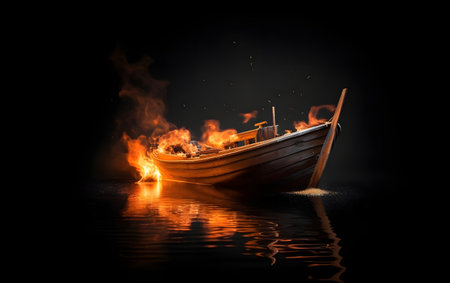 A striking image of a burning paper boat floating on still water under a moody overcast sky. The flames contrast beautifully with the serene landscape, creating a captivating scene.