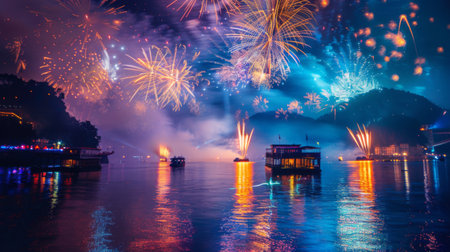 Enjoy a breathtaking view of a vibrant fireworks display illuminating a harbor at night. Colorful lights reflect off calm waters, enriching the festive atmosphere.