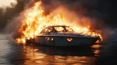 Dramatic sunset over a burning boat on a tranquil lake