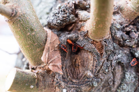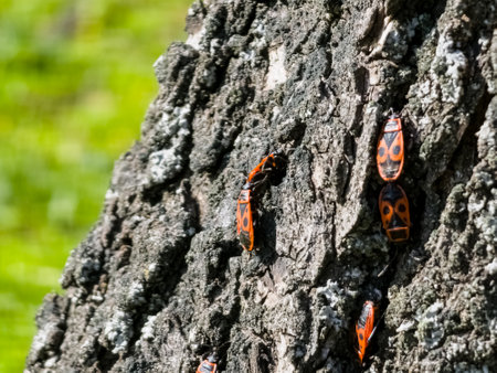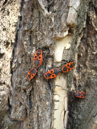 Colony of Pyrrocoris Apterus nests on the trunk of an acacia tree. Red spotted beetles or Pyrrocoris Apterus on bark.