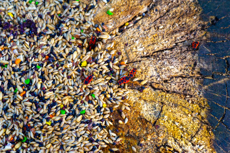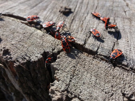 colony of red beetles came out the spring sunbathing at the foot an old oak