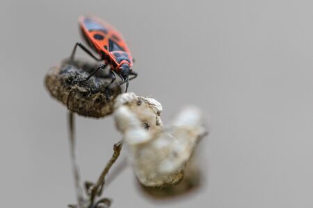 Firebug (Pyrrhocoris apterus) on the dry plant, macro shot, copy space, selected focus, very narrow depth of field
