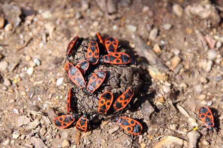 Macro photo of Asian firebugs (Pyrrhocoridae) sharing food. They are eating together a fruit falling in the ground in a forest
