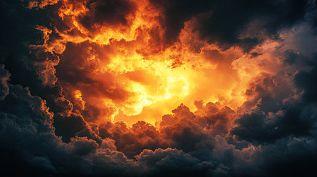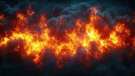 Vivid flames illuminate the dark sky, blending heat and light with swirling clouds.