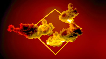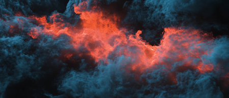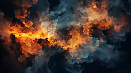Hot fire explosion with fantastic thick smoke on dark background for graphic design. abstract backdrop. glow effect. 3d rendering digital illustration