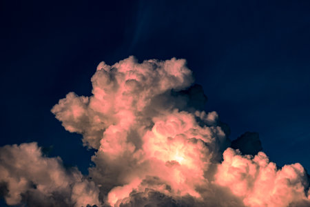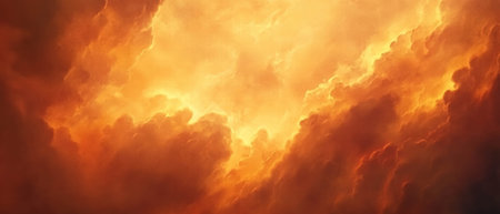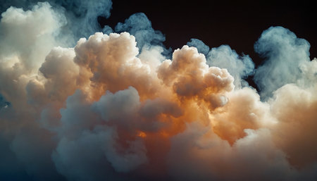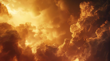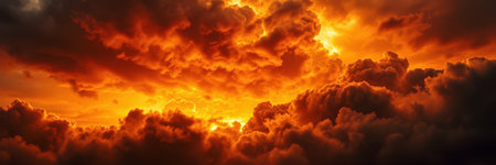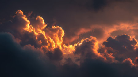 Majestic clouds illuminated by vibrant sunset create stunning display of orange and gray hues. dramatic sky evokes sense of wonder and tranquility, perfect for nature lovers