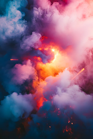 This stunning image showcases a vibrant explosion of colorful smoke and clouds, brilliantly contrasting against a dark background, creating an artistic and dramatic effect.