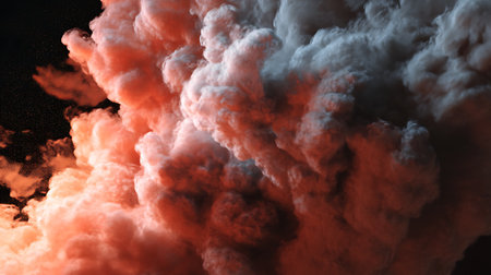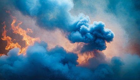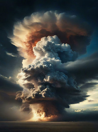 A breathtaking image of a massive smoke plume, resembling an apocalyptic cloudscape. Fiery tones blend with dark gray clouds, creating a dramatic, powerful scene.