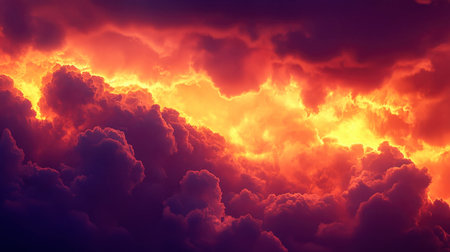 Experience the captivating beauty of dramatic clouds illuminated by fiery orange and purple tones, creating a stunning atmospheric scene ideal for artistic projects.
