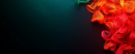 A Vibrant abstract background featuring colorful textured fibers in red, orange, and green against dark surface, creating dynamic visual effect