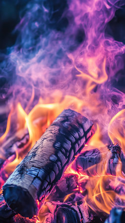 Close-up of burning firewood with vibrant purple and orange flames, smoke swirling around. Energy and warmth concept
