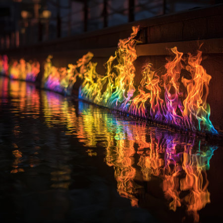 Rainbow fire creating a stunning visual display and vibrant reflections on the water surface, capturing the dynamic energy of light and color in a dark, atmospheric setting