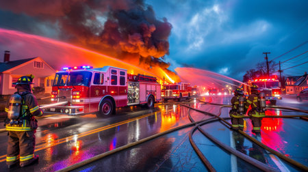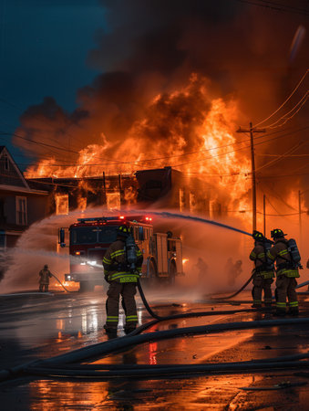 Dramatic scene of fighting firefighters flames in a city, water jets soaking a burning home