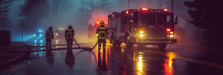 Firefighters fighting a large fire with smoke and fire extinguisher on dark toned foggy background