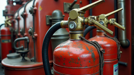 Vintage red fire extinguishers in industrial setting. That the image is generated using AI.