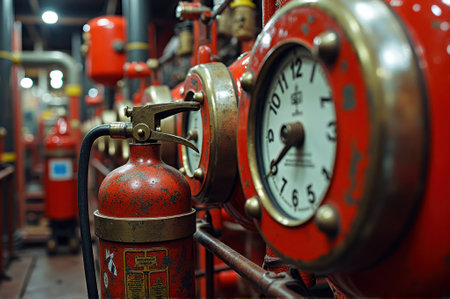 Red fire safety equipment with pressure gauges in industrial setting. That the image is generated using AI.