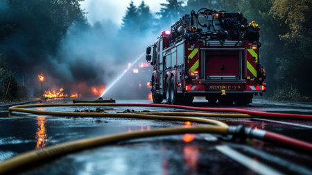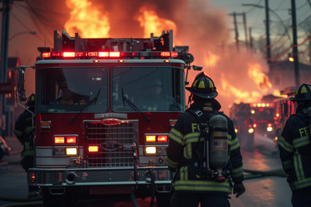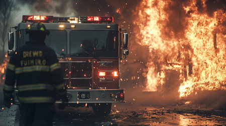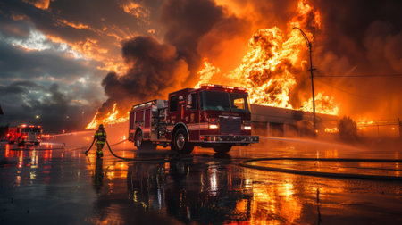 Firefighter in action, battling a fierce blaze with a powerful hose, flames engulfing a building in the background, fire truck and team on standby, intense and heroic atmosphere