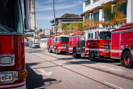 Santa Cruz fire engines line a sunlit street by the beach promenade