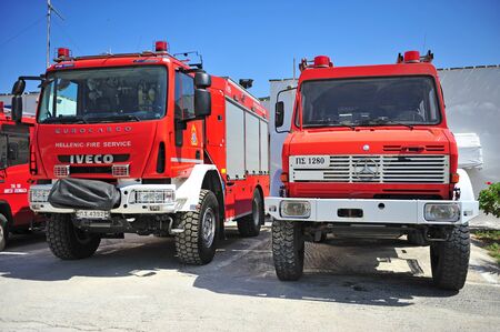 PARIKIA, GREECE - APRIL 14: Hellenic fire service trucks in Parikia, Greece on April 14, 2018.