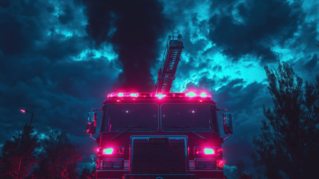 Powerful fire truck standing front and center, its sirens and ladder extending into the sky.