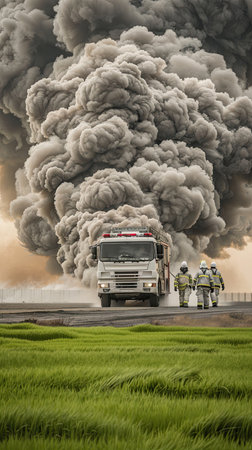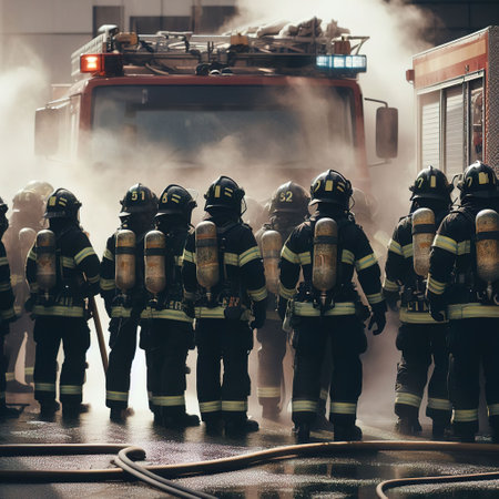 An AI-generated illustration of the firefighters in full attire standing in front of a fire truck