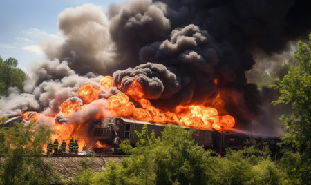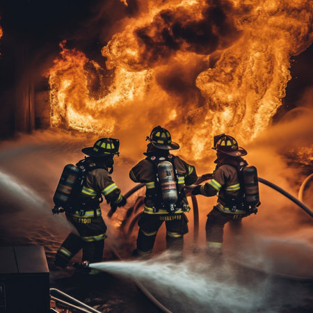 diverse group LGBTQ firefighters works together fight towering blaze glow emergency lights demonstrating courage and teamwork challenging situation.