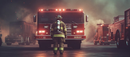 Firemen in uniform and helmet near fire engine back view. Generative AI.