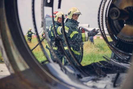 Two firemen using water from hose for fire fighting at firefight training of insurance group