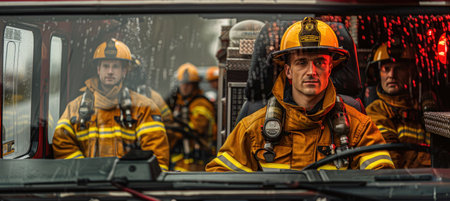 A group of firefighters in their personal protective equipment are driving a fire truck to the event. They look like characters from an action film