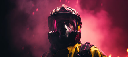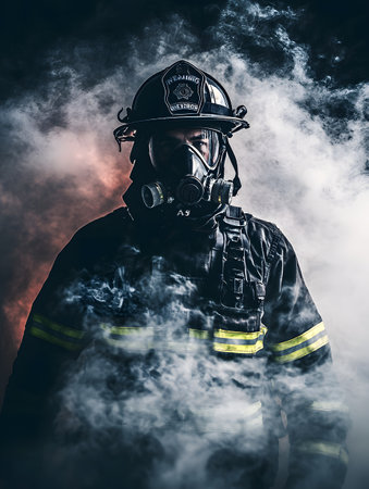 A firefighter stands amidst thick smoke, wearing full protective gear including a helmet and oxygen mask. The firefighter's uniform is equipped with reflective strips for visibility, highlighting their readiness and dedication to duty. The scene conveys a sense of urgency and bravery.
