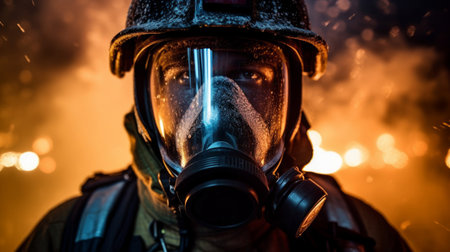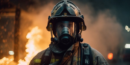 Brave firefighter in full protective gear standing amidst thick smoke and flames while responding to a critical fire emergency situation Concept of heroic rescue and life saving services