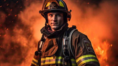 reverent, confident man working in fire station ready to save people from fire in emergency situations, wearing uniform and helmet
