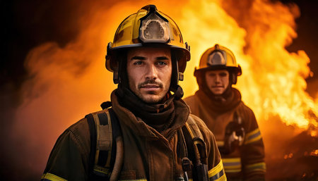 Firefighters battling blaze, intense flames, teamwork in action, heroic atmosphere