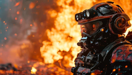 A firefighter in protective gear confronts a blaze, surrounded by billowing smoke and red flames, showing bravery.