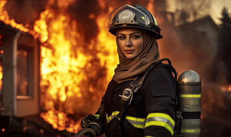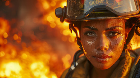 Heroic black female firefighter gazes confidently through fire. Strong African American woman in firefighting helmet and uniform. Concept of empowerment, emergency service, fire defense, and valor.