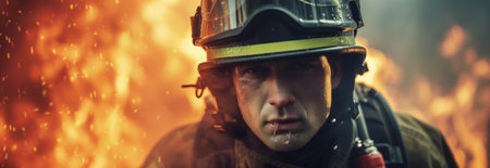 A young male firefighter with intense eyes and a soot-dusted face stands resolute against a backdrop of raging flames and emergency vehicles. A.I.