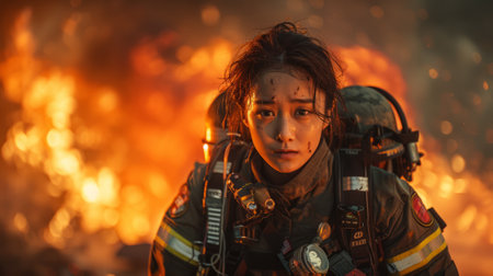 Asian firefighter against a backdrop of fire. Heroic female firefighter confronting a conflagration. Concept of heroic action, emergency service, fire combat, and public protection. Copy space