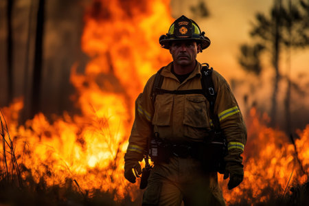 An AI generated illustration of a firefighter standing in front of a roaring fire