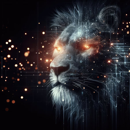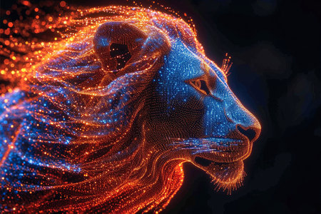A stunning 3D rendering of lions face, showcasing digital mesh design with glowing particles, creating captivating visual effect..