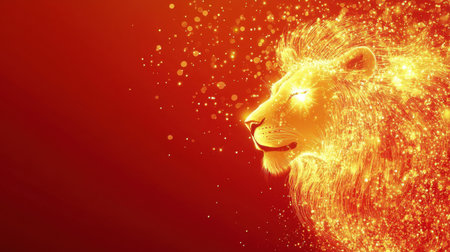 A majestic lion is depicted in profile, its fiery mane and face illuminated against a dark backdrop. The artwork showcases vibrant orange and red hues with detailed textures. The image suggests a powerful presence and could be suitable for various commercial or artistic applications.