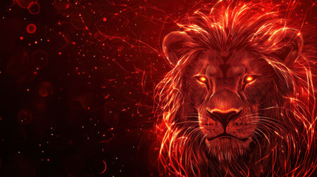 This striking artwork features a majestic lion with glowing red eyes, surrounded by a dynamic array of fiery sparkles and lights, symbolizing power and strength.
